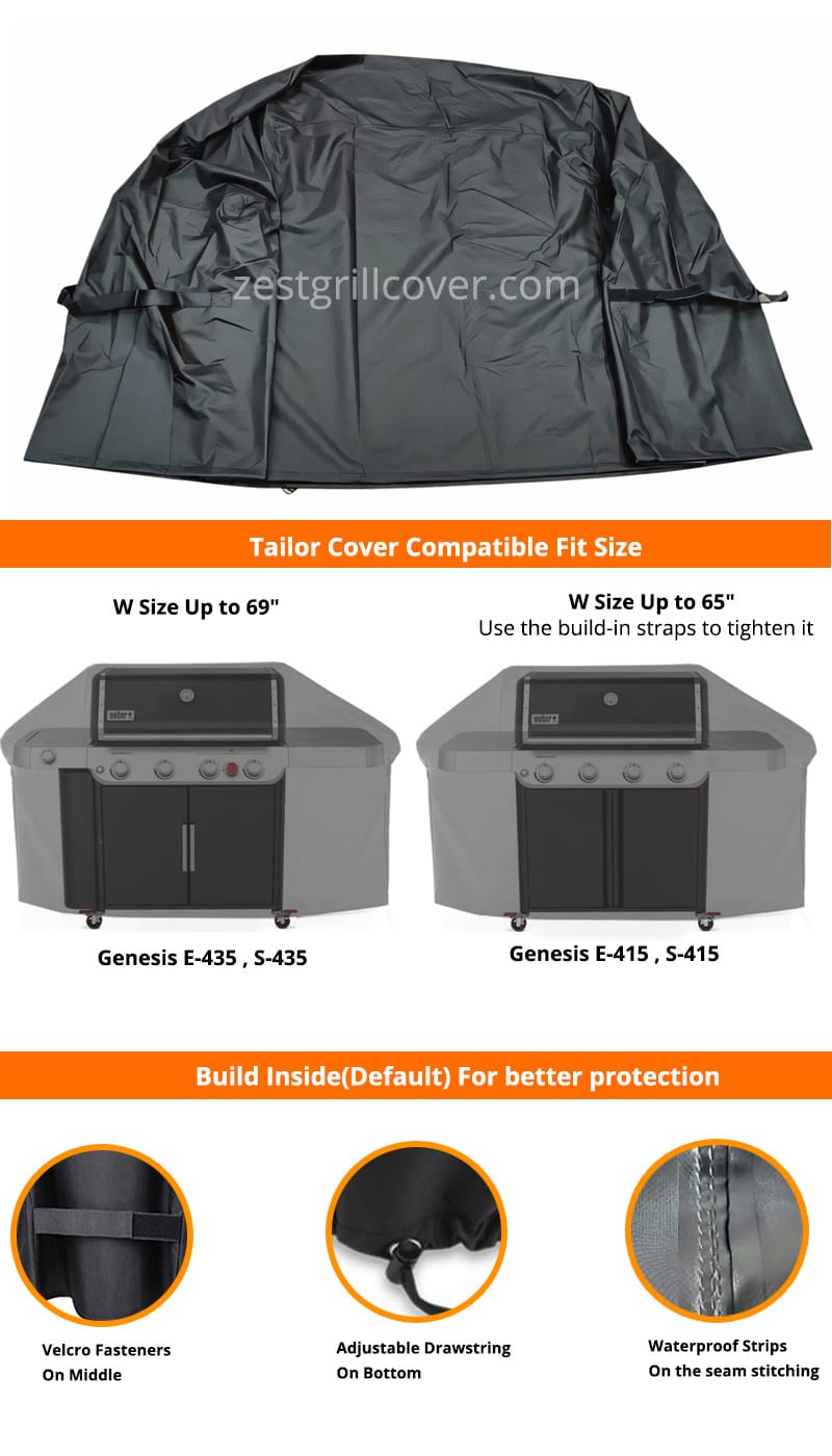We made this K185 model grill cover universal fit for most Genesis 400 Series with 69″ width(It will fit a bit loosely while wearing this K185 cover on the Genesis S-415 model)